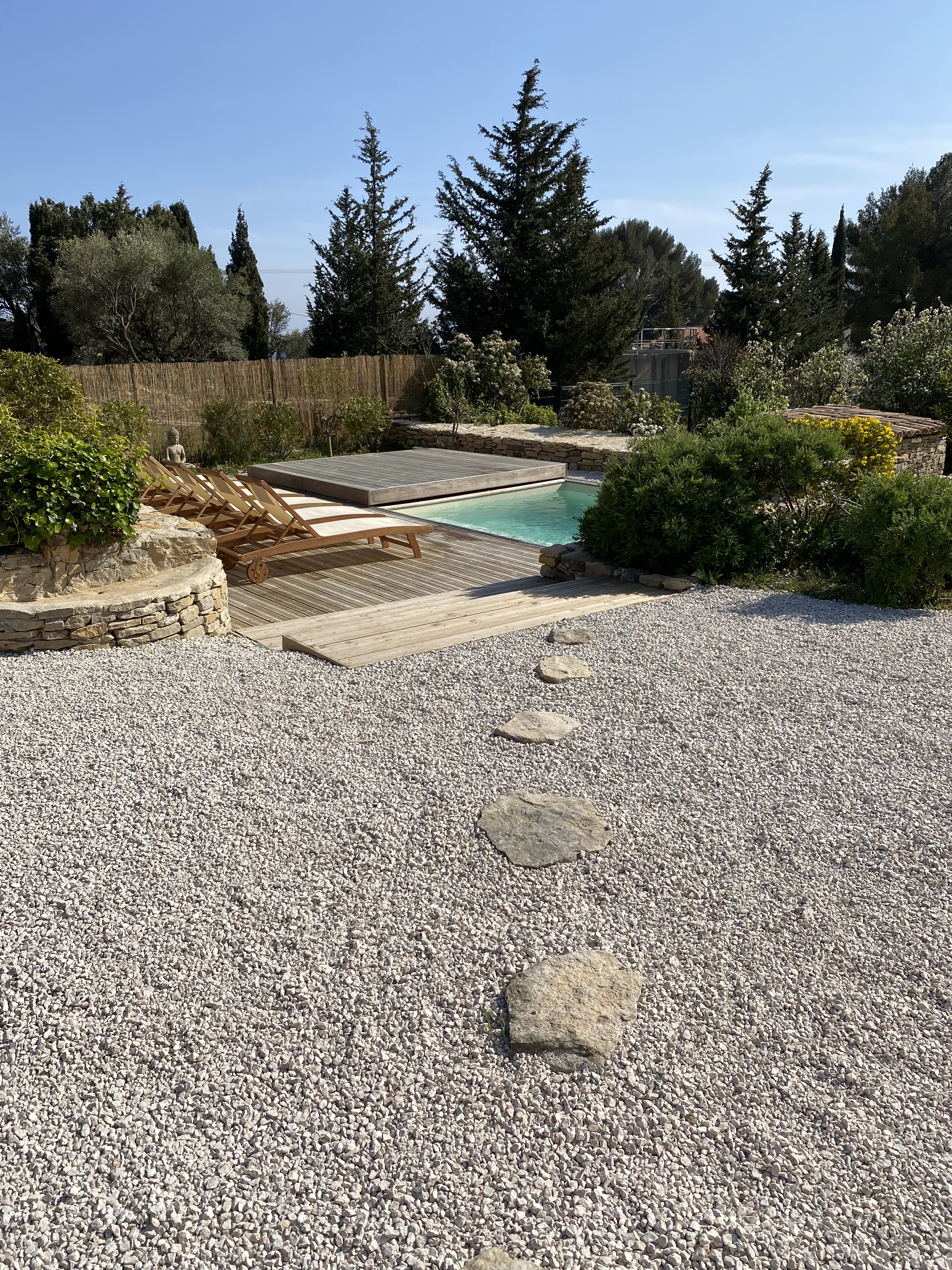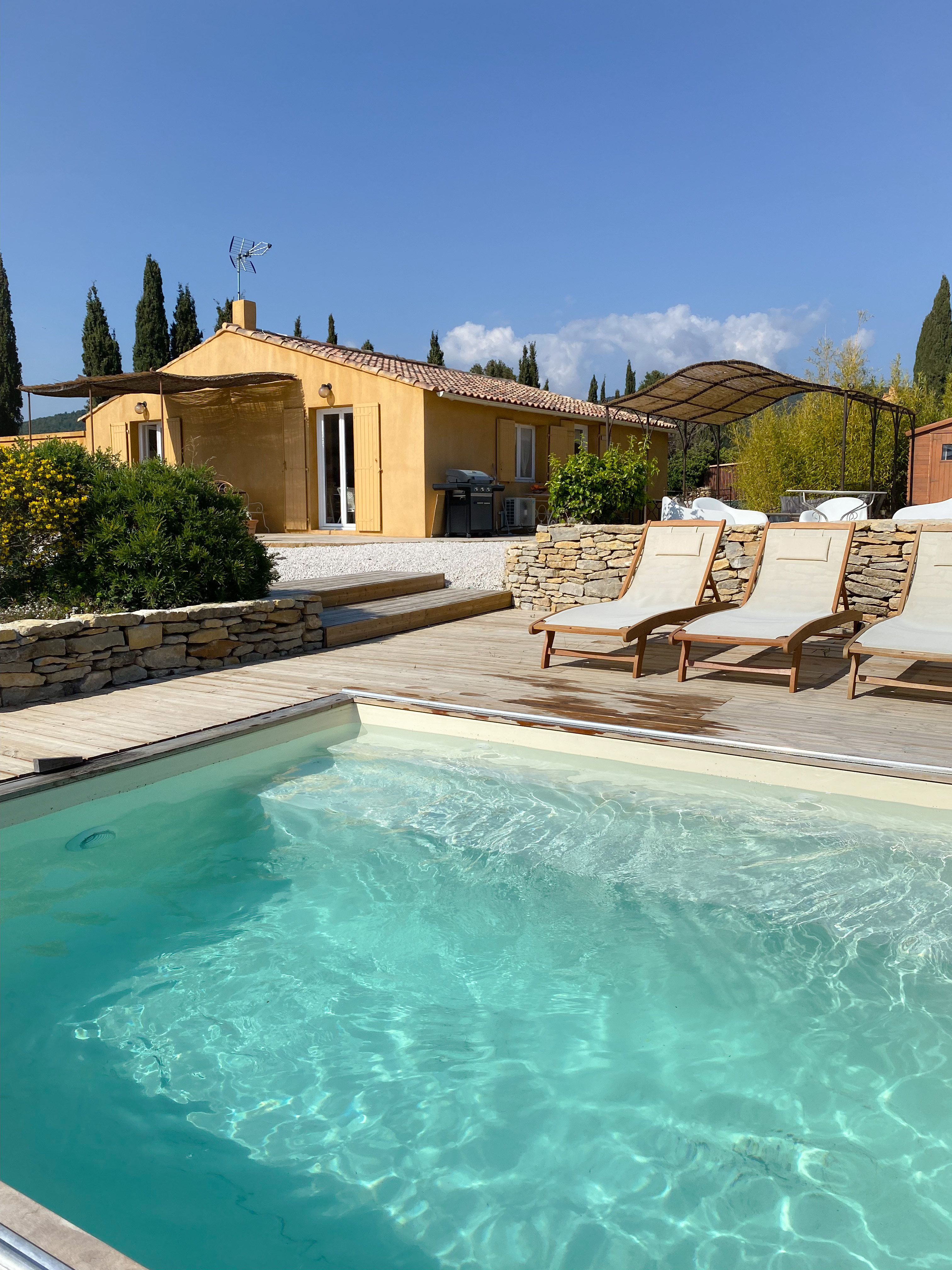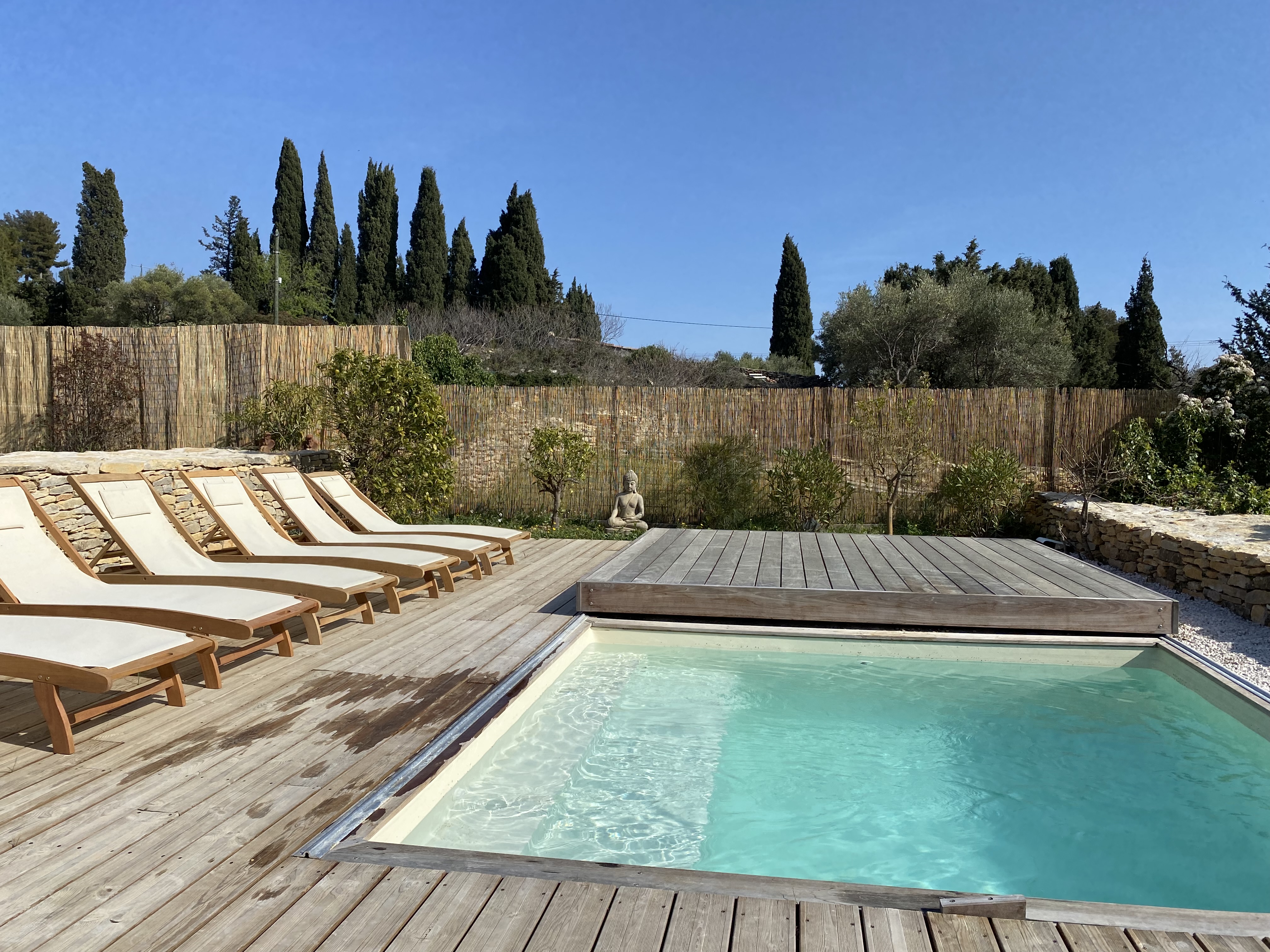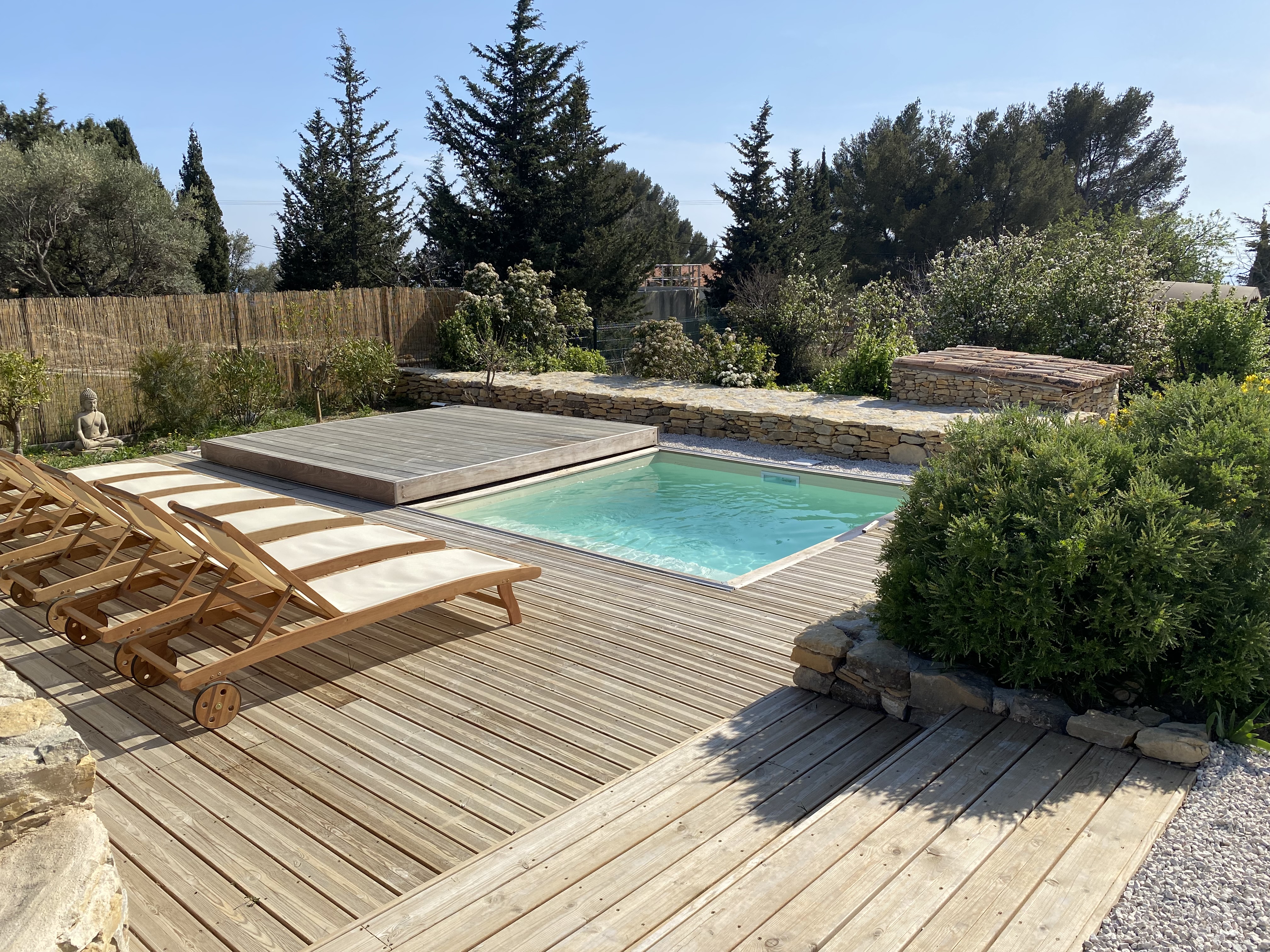 Le plus, sa petite piscine privative carrée de 10m2 entièrement sécurisée par un deck coulissant ; terrasse en bois tout autour avec relax et douche solaire.