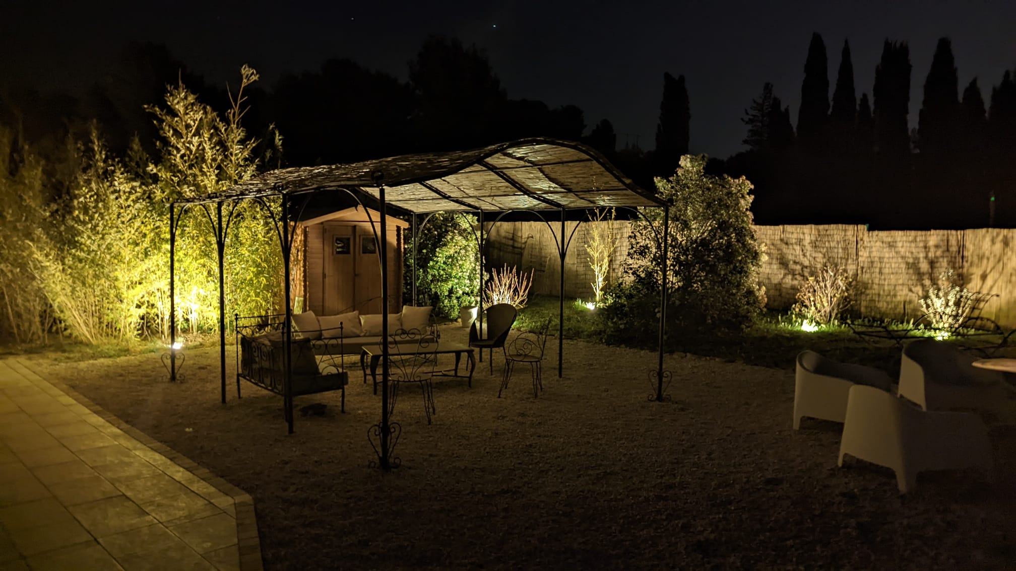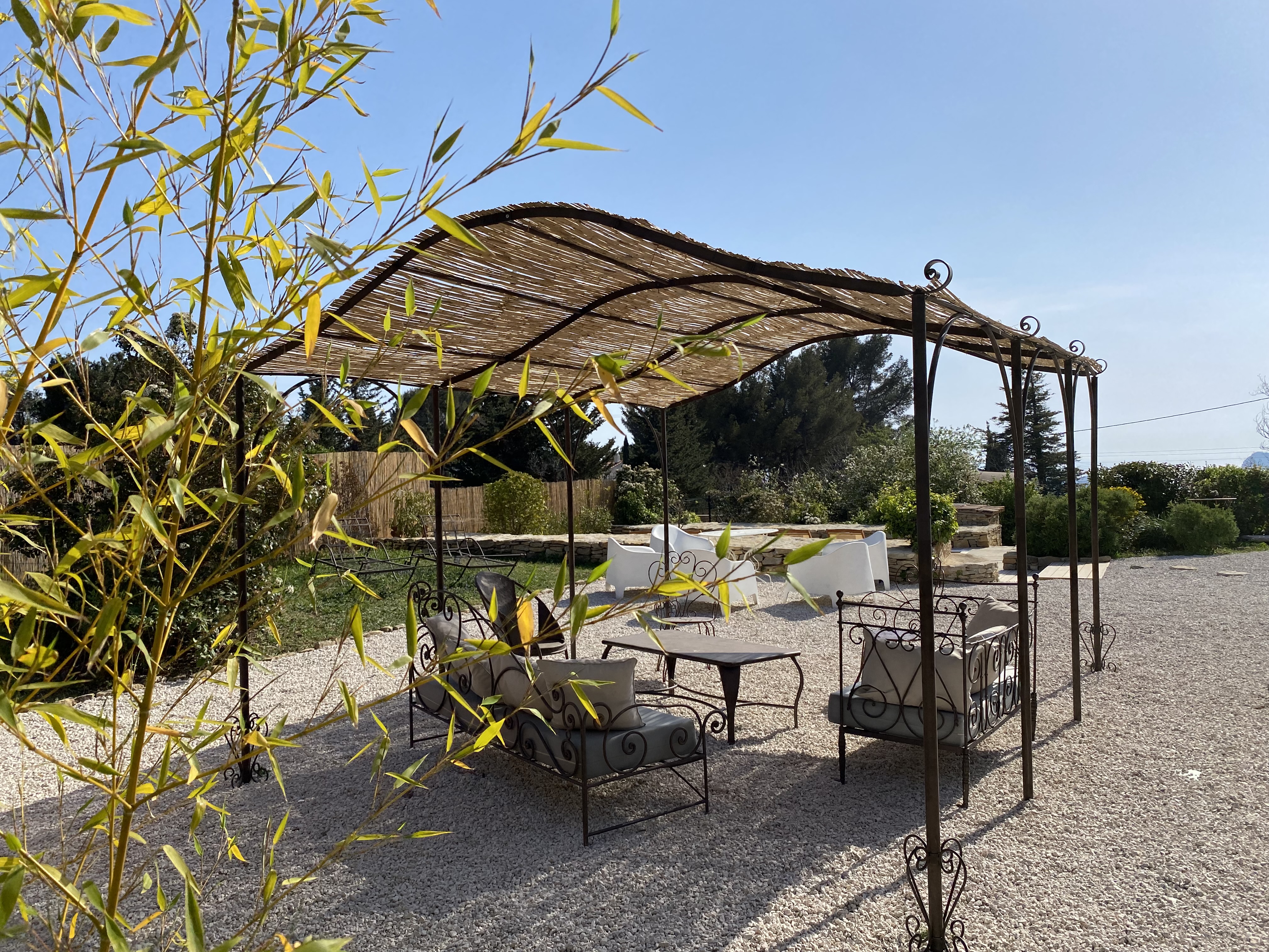 Devant la maison, grande terrasse carrelée, ombragée pour prendre les repas et sur le coté, pergolas avec salon de jardin, coin détente.